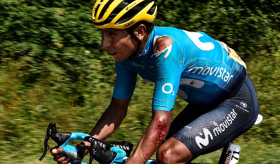 A la altura del kilómetro 95, el colombiano Nairo Quintana sufrió una caída y debió ser atendido por los médicos de la carrera, debido al duro golpe de la cual fue objeto el del Movistar.