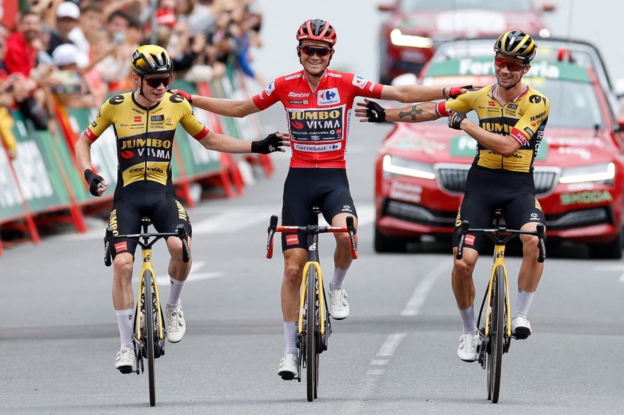 El estadounidense Sepp Kuss (Jumbo Visma) vivió momentos especiales y de mucho emoción cuando entró en la meta de Guadarrama abrazado con sus compañeros de equipo y componentes del podio final Jonas Vingegaard y Primoz Roglic.