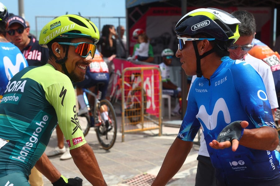 Una imagen que habla por sí sola de la amistad y el respeto que se tienen, pese a estar en equipos diferentes. Nairo Quintana defiende al Movistar Team, mientras que Daniel Felipe Martínez representa al Bora Hansgrohe. Vale la pena acotar que Martínez es segundo de la general atrás de Tadej Pogacar a 2’40¨.