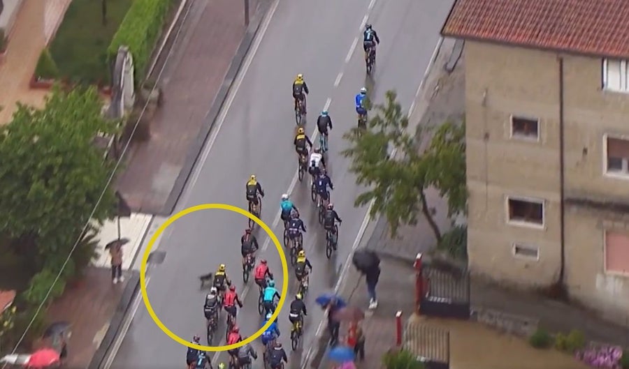 Sin embargo, el belga fue protagonista de un particular momento a raíz de una caída que sufrió luego de que un perro se atravesara en el recorrido del pelotón.