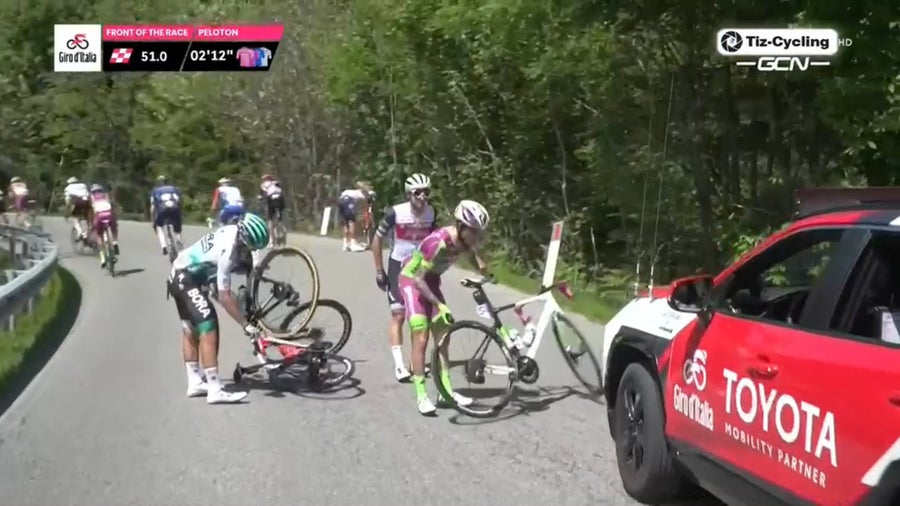 Bramdilla, uno de los pedalistas con mayor experiencia en el pelotón general, sufrió una fuerte caída que lo sacó de inmediato de la ronda italiana. Auqnue se levantó tras el golpe, no pudo retornar a la bicicleta por el dolor que sentía y decidió abandonar.