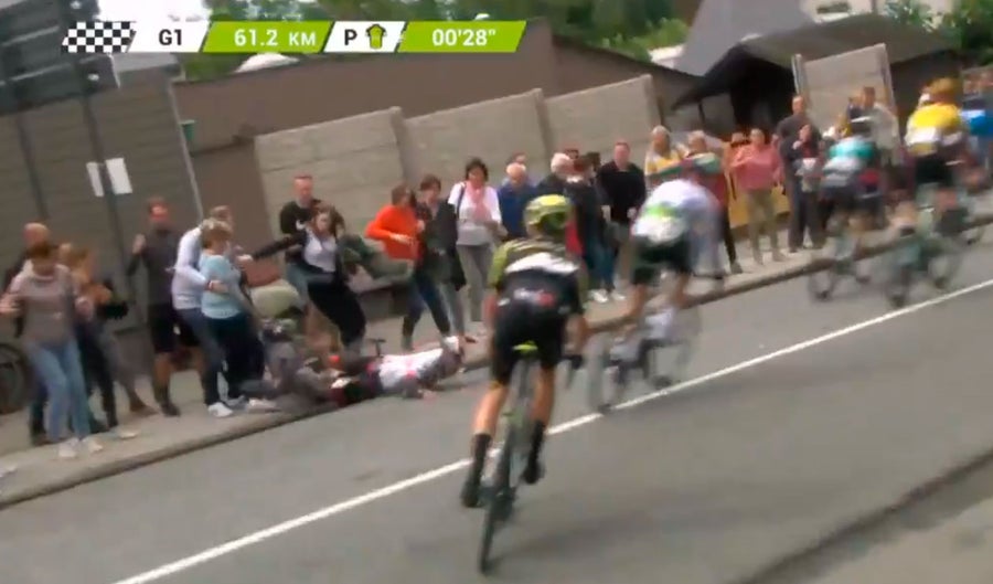 A 61 kilómetros de meta en la última etapa del BinckBank Tour, el ciclista colombiano Juan Sebastián Molano sufrió una violenta caída cuando se disponía a tomar una curva. Así lo captó la señal oficial de televisión donde se apreció cómo su bicicleta no pudo mantenerse estable, dejando sin opción al corredor boyacense.