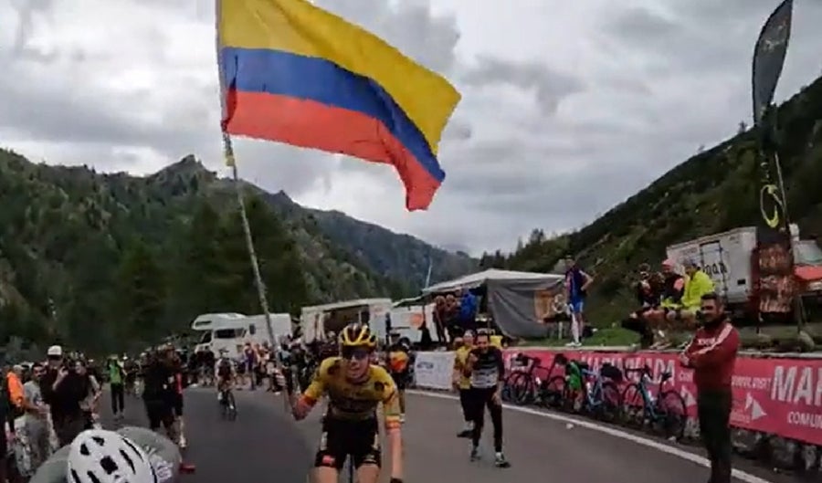 Pues el pedalista Pascal Eenkhoorn (Bora), tomó una bandera de Colombia, la cual estaba en poder de aficionados alrededor de la carretera, y la ondeó dejando risas a su andar.
