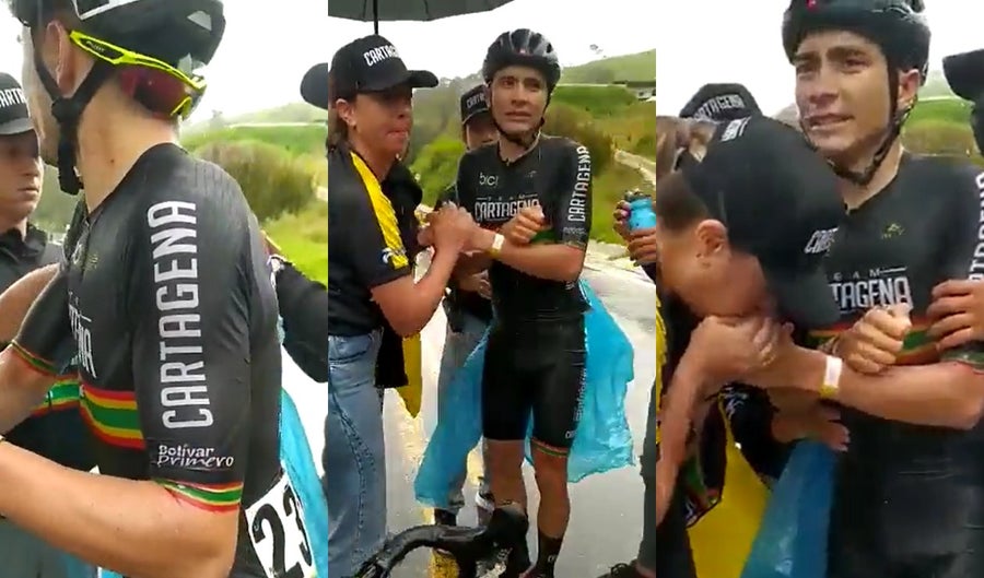 “Una pequeña muestra de la dureza del ciclismo. Etapa 5 de la Vuelta a Colombia Yarumal - La Unión, 190km. Como este muchacho fueron muchos los que tuvieron que abandonar por hipotermia”, escribió Peña con un video donde se ve a Quiceno recibiendo asistencia.