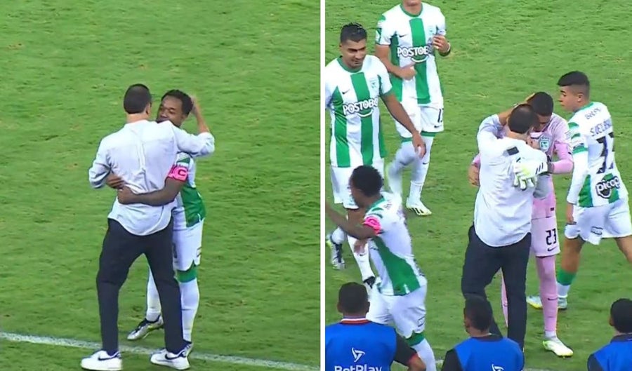 Después del capitán del equipo visitante llegó el portero Kevin Mier a quien Restrepo tampoco dudo en abrazar. Seguido vinieron otros futbolistas del equipo verdiblanco para tener una muestra de afecto con su antiguo DT.
