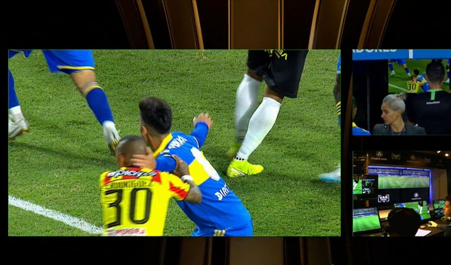 La situación ocurrió sobre el minuto 43 y tras un tiro de esquina que llega a la zona de peligro, el cual es es definido por Juan Sebastián Quintero, pero al revisar, el juez central toma la decisión de validar primero la falta.