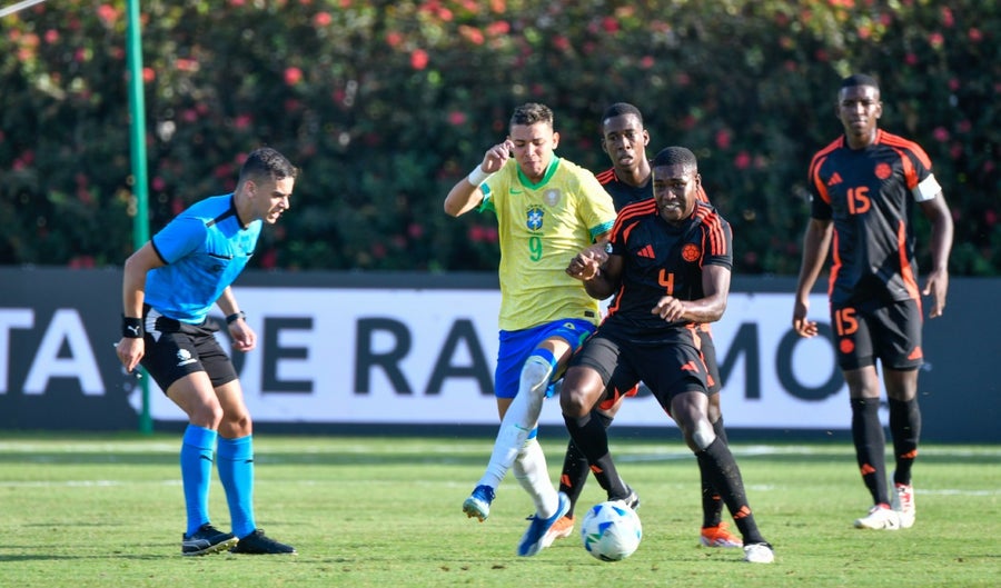 El partido comenzó en el estadio Misael Delgado con intensidad en el mediocampo. Colombia generó la primera aproximación con un remate de Neyser Villarreal que terminó en tiro de esquina. Brasil respondió con una jugada de Pedro, quien logró ingresar al área, pero fue bloqueado por la defensa colombiana.