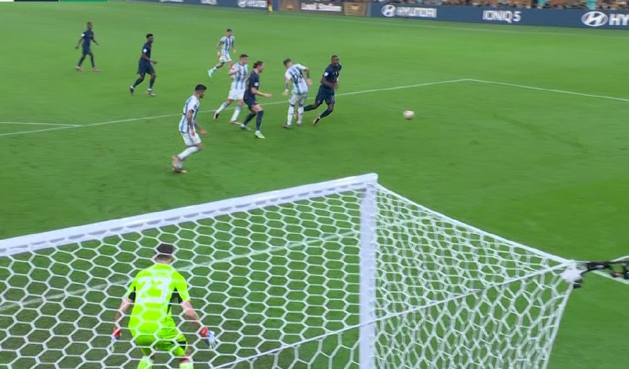 Lionel Messi y Ángel María adelantaron a los sudamericanos 2-0 y consiguieron la ventaja transitoria pare el equipo de Lionel Scaloni. La polémica apareció en el primer gol del conjunto sudamericano, la falta de Ousmane Dembélé sobre el delantero fue casi invisible, pero el VAR dio la jugada como infracción en el área. Messi transformó el cobro y puso la ventaja.