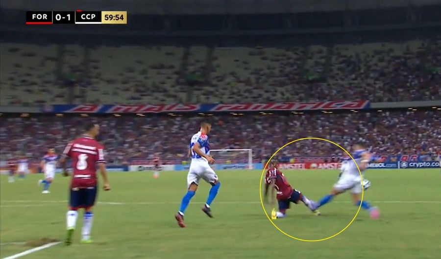 La acción se da por una disputa del balón confusa, que terminan rechazando los locales y la pelota llega hasta Marcelo da Conceição, el defensor del equipo brasileño que recibe la patada de Rivas. A continuación la jugada que se volvió rápidamente viral: