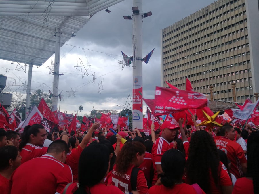 Considerada por muchos como la fanaticada más fiel, los hinchas de ‘la mechita’ de festejaron hasta altas horas de la madrugada con juegos pirotécnicos, caravanas vehiculares y peatonales que desde el cielo se ven como ríos rojos por las principales vías de Cali.