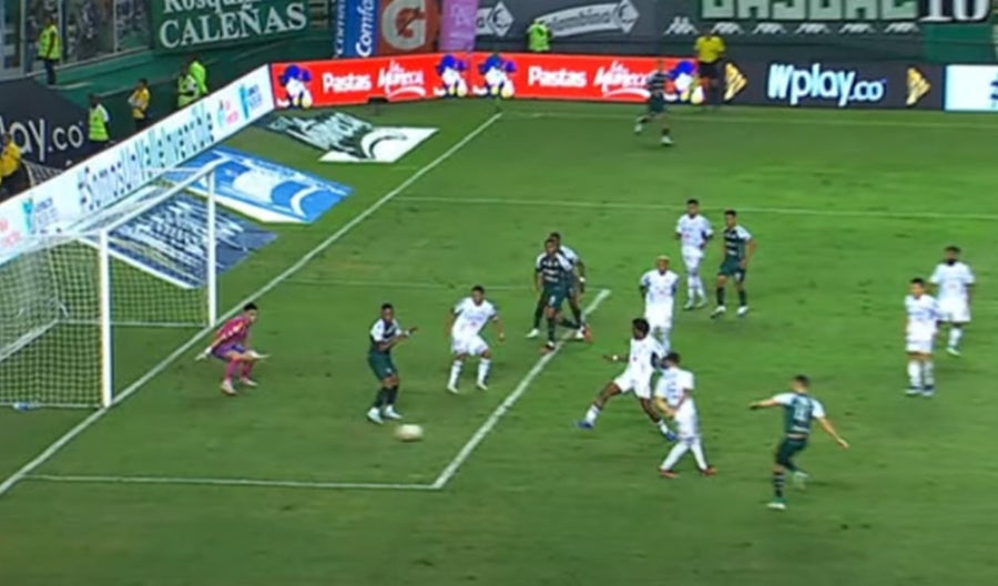 Sin embargo, otra toma de la jugada muestra que el arquero del Junior tratando de mirar hacia el balón ante la obstrucción que estaba haciendo Vásquez: "Hay una interferencia, punto de contacto. El jugador que está en fuera de juego se encuentra en la misma línea del guardameta", concluyen los árbitros del VAR.
