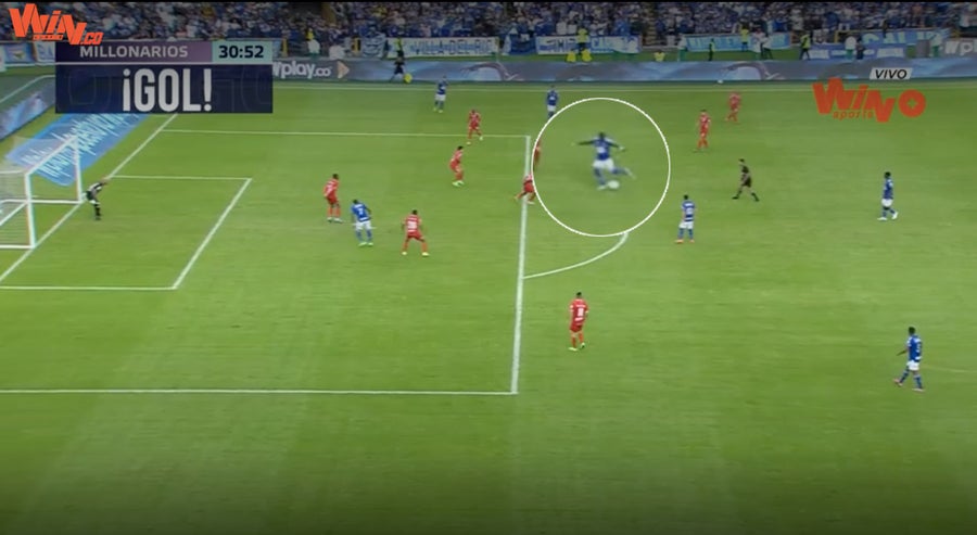Luego que América de Cali se fuera en ventaja en el primer tiempo, el extremo de Millonarios, Carlos Andrés Gómez, puso la igualdad en El Campín con un soberbio disparo de media distancia.
