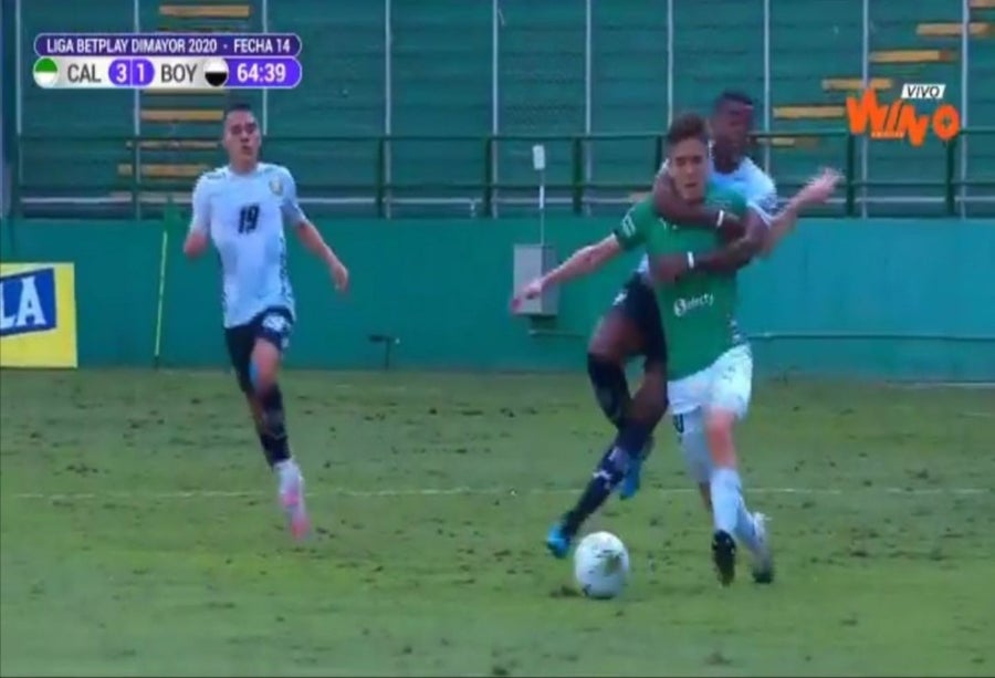 Y es que cuando se disputaba el minuto 64, Deportivo Cali emprendió una rápido liderado por el volante Agustín Palavecino, pero la acción fue interrumpida por una sorprendente infracción, al mejor estilo de la lucha libre, del volante de Boyacá Chicó Jhon González.