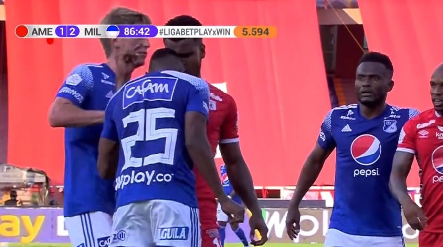 Emerson Rivaldo Rodríguez, uno de los jugadores más importantes en el juego de Millonarios, fue expulsado en la ida de los cuartos de final de la Liga Betplay ante el América de Cali. El jugador se salió de casillas y le dio un cabezazo al rival. Por supuesto, el árbitro le mostró la tarjeta de inmediato.