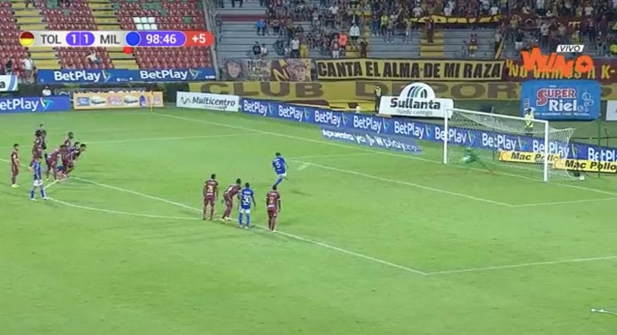 El defensa realizó el disparo, pero su remate salió por encima del horizontal, dejando escapar así la oportunidad de darle el triunfo a Millonarios en Ibagué.