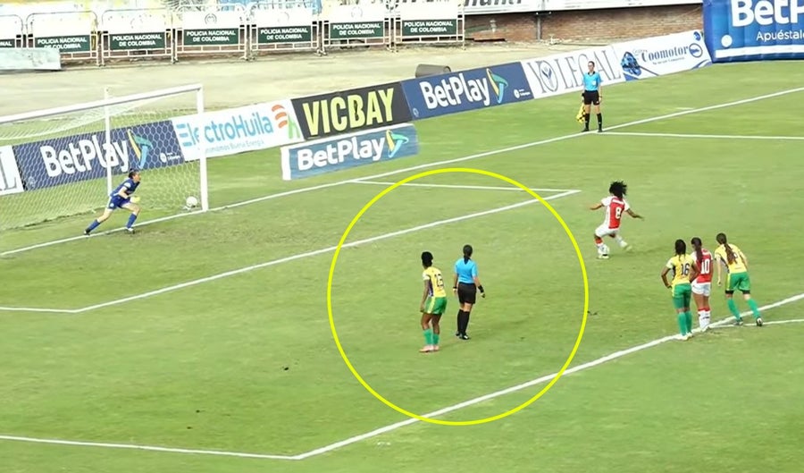 El hecho se presentó sobre el minuto 45, la que cobró fue Paola García, quien terminó pegándole al palo, pero ni la juez central, ni la de línea se dieron cuenta de la invasión de una de las futbolistas rivales, que estaba ubicada detrás de la árbitra y en la zona del cobro.