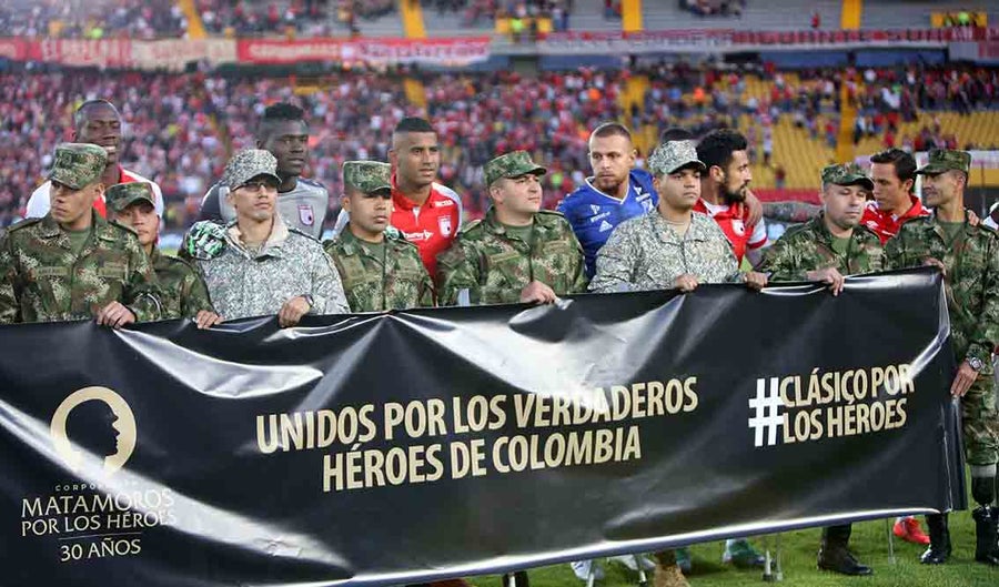 Los jugadores y los uniformados posaron también para una foto con una pancarta con el mensaje: "Unidos por los verdaderos héroes de Colombia" y con el numeral "#ClásicoPorLosHéroes".