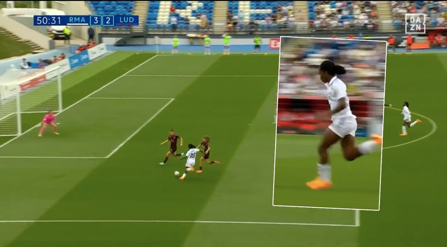 De nuevo Linda, cuatro minutos más tarde cogió un balón desde el centro del campo para correr por la banda hasta el área del Levante y asistir a Weir para que esta pusiese el balón en la escuadra rival. De esta forma Linda ya suma 4 asistencias en Liga con el Real Madrid desde su llegada al club blanco en el mes de febrero.