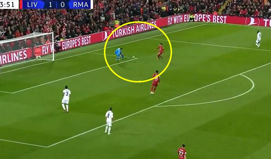 Sin embargo, el gol que para muchos televidentes e internautas resultó más llamativo, fue el segundo, ya que Thibaut Courtois tuvo una pifia, resbalándose frente al arco, y dejando la posibilidad a Mohamed Salah para ampliar la ventaja.