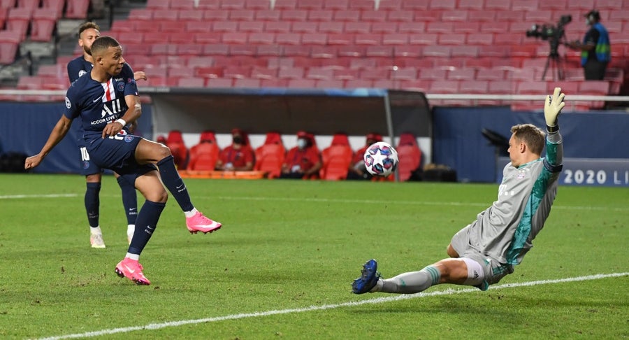 Antes de terminar la primera parte el portero alemán volvió a aparecer, para seguir fortaleciendo su estatus como figura, cuando en un error de Alaba, el balón quedó servido para el jugador Mbappé y otra vez achicando los espacios el portero logró desviar el balón.