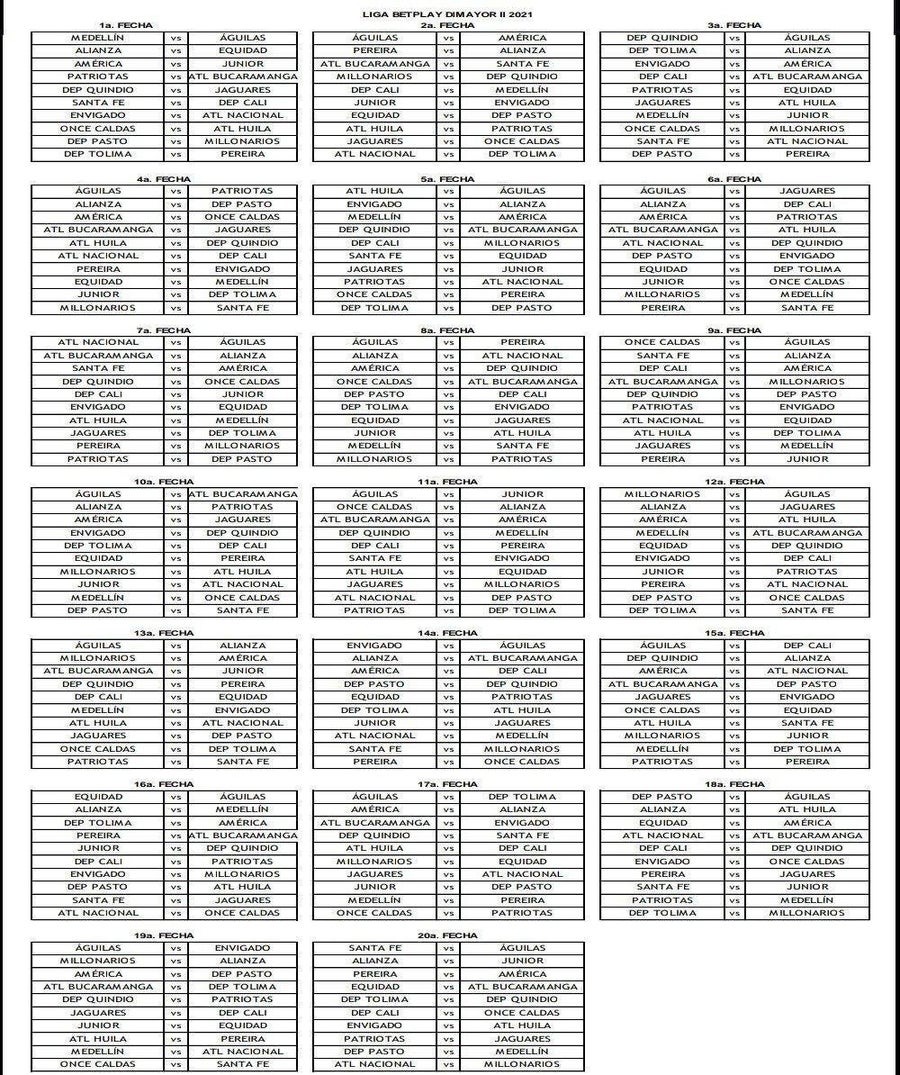 La Dimayor confirmó el calendario para la Liga Betplay del segundo semestre que comenzará el fin de semana del 18 de julio. Los compromisos de la primera fecha serán: Independiente Medellín vs Águilas, Alianza Petrolera vs Equidad, América vs Junior, Patriotas vs Atlético Bucaramanga, Deportes Quindío vs Jaguares, Independiente Santa Fe vs Deportivo Cali, Envigado vs Atlético Nacional, Once Caldas vs Atlético Huila, Deportivo Pasto vs Millonarios y Deportes Tolima vs Pereira.