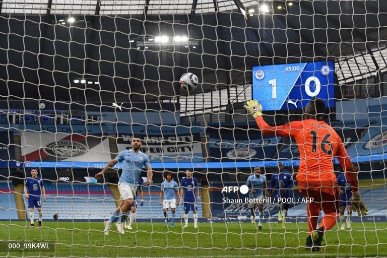 El argentino Sergio 'Kun' Agüero falló un penalti, lanzado al llamado estilo 'panenka' que detuvo sin problemas el portero Edouard Mendy, en el tiempo añadido de la primera parte del partido que disputan el Manchester City y el Chelsea en la fecha 35 de la Premier League.