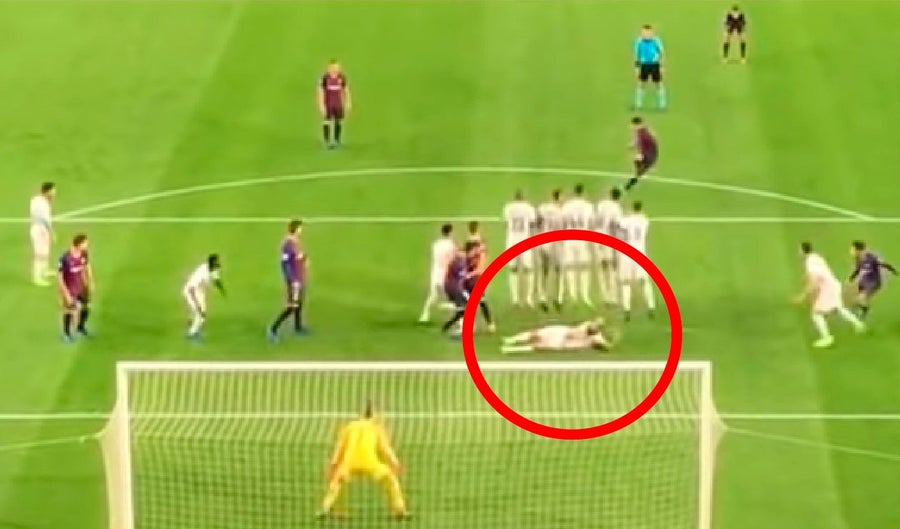 Cuando Luis Suárez se disponía a patear un tiro libre; y luego de que el portero del Inter acomodara la barrera, el mediocampista croata Marcelo Brozovic se lanzó al suelo para acostarse detrás del ‘muro humano’ y de esa forma evitar que el balón pasara por debajo de ellos tras saltar en el intento de despejar la pelota.