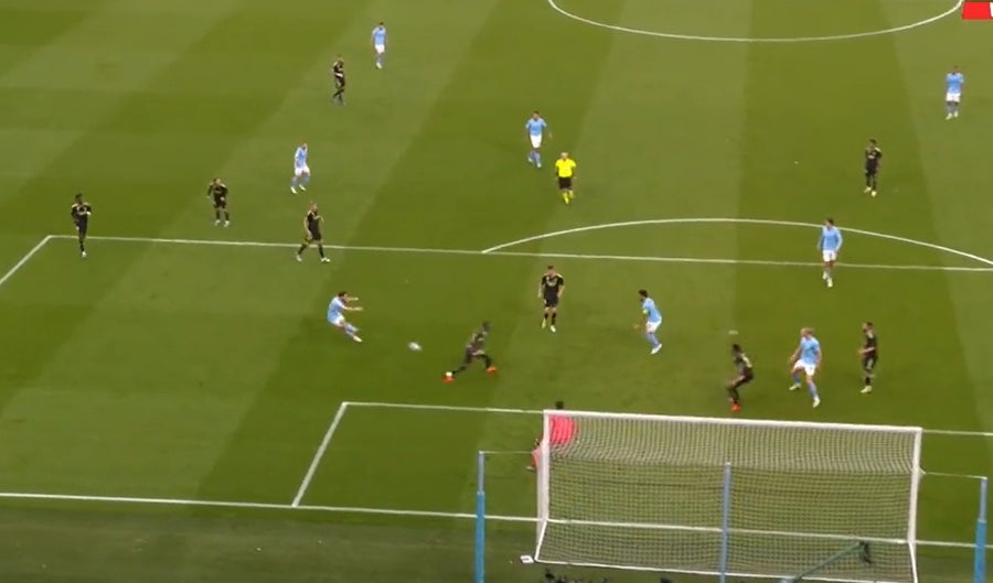 Jack Grealish condujo ante la relajación de Toni Kroos y de Dani Carvajal, que priorizaron retroceder mientras el inglés avanzaba. Entró Ilkay Gündogan desde segunda línea atacando el espacio, llevándose un rebote que quedó franco para que el luso rematara con la cabeza para batir a Thibaut Courtois.