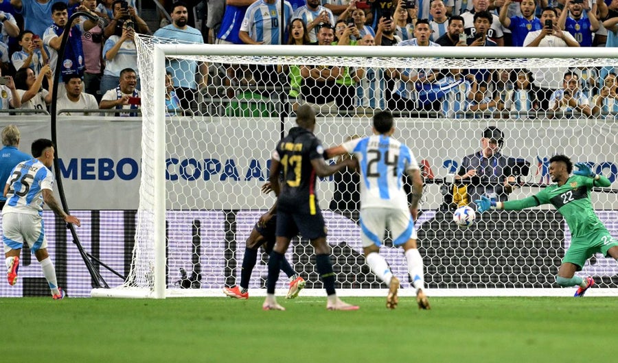 Argentina despertó e inquietó con un remate de Enzo Fernández que se desvió en un zaguero para enviar al córner. De hecho, en ese tiro de esquina, Lionel Messi lo ejecutó al primer palo. Alexis Mac Allister peinó la pelota para que, a metros del arco, cabeceara Lisandro Martínez. Aunque Alexander Domínguez intentó despejarla, el balón ya había ingresado por toda la línea.