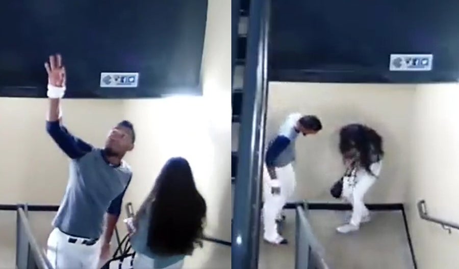 En medio de la acción, se ve que alguien le reclama, por lo que el beisbolista le pide que no se meta, baja y nuevamente agrede a la mujer que ya se encuentra tirada en el piso.