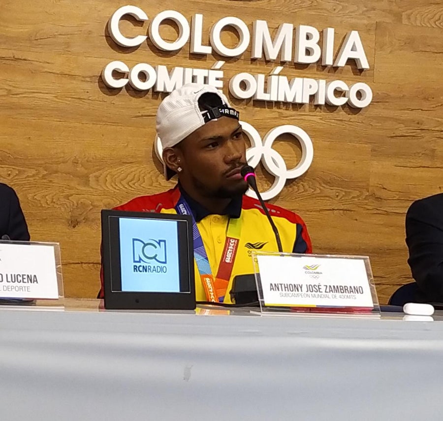 El atleta colombiano Anthony Zambrano estuvo en Bogotá dando una rueda de prensa luego de su histórica medalla de plata en los Mundiales de Atletismo donde se colgó la presea de plata en la prueba de los 400 metros planos y luego lideró el cuartero colombiano que fue cuarto en la prueba de los relevos.