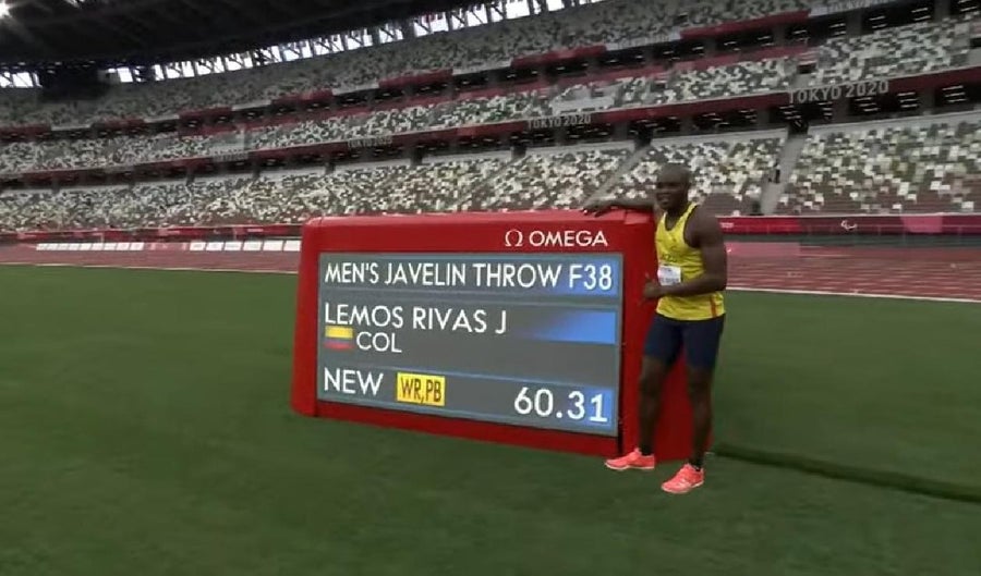 José Gregorio Lemos Rivas se subió al primer lugar del podio en la categoría F38 al lograr una marca de 60.31 metros, que además de darle la presea dorada, le dio un nuevo récord del mundo.