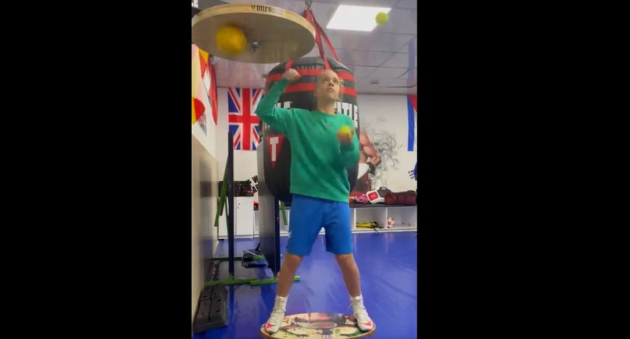La joven está ubicada encima de una tabla sobre un rodillo haciendo equilibrio, al mismo tiempo hace malabarismo con dos pelotas de tenis y por si fuera poco le pega puños a una pera de boxeo con su mano derecha.