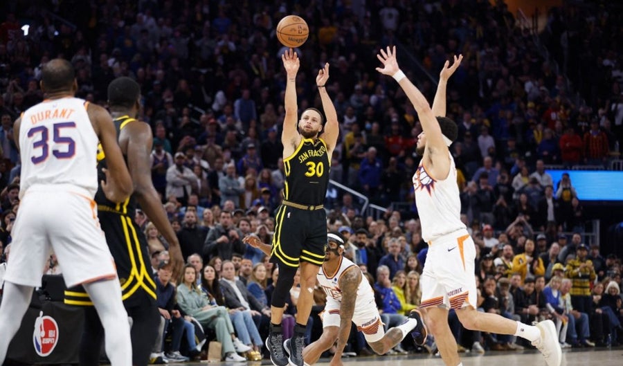 Con otro de sus triples para el recuerdo, Stephen Curry brindó el sábado el triunfo a sus Golden State Warriors por 113-112 ante los Phoenix Suns de su excompañero Kevin Durant.